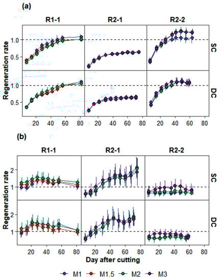 Changes in regeneration rate of (a) plant height and (b) tillers for each regime and ratoon crop. R1-1, R2-1, and R2-1 represent the first ratoon of the first main crop, first ratoon of the second main crop, and second ratoon of the second main crop, respectively. DC and SC indicate double and single cuttings, respectively. M1, M2, and M3 represent saturated, humid, and dry soil moisture conditions, respectively. Data are mean ± standard error (n = 16, 4 hills × 4 replications).