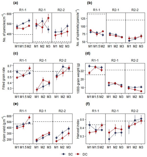 Comparison of differences in cutting and soil moisture regimes on yield components (a–d), grain yield (e), and harvest index (f) of each ratoon. Horizontal dashed lines indicate the mean value of the main crop for each ratoon (n = 24). R1-1, R2-1, and R2-1 represent the first ratoon of the first main crop, first ratoon of the second main crop, and second ratoon of the second main crop, respectively. M1, M2, and M3 represent saturated, humid, and dry soil moisture regimes, respectively. M1.5 was between the M1 and M2 levels. SC and DC represent single- and double-cutting regimes, respectively. Values for the ratoons represent the mean ± standard error of each treatment (n = 4).