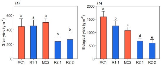 Comparison of grain yield (a) and biological yield (b) are described in order of cropping. Ratoon crops were cultivated under different cutting and moisture regimes. MC1 and MC2 represent the first and second main crop, respectively. R1-1, R2-1, and R2-2 indicate first ratoon of MC1 and first and second ratoons of MC2, respectively. Data are means ± standard error, sample size n = 24. Same letters above the bar did not significantly differ at the 5% level by Tukey’s honestly significant difference (HSD) test.