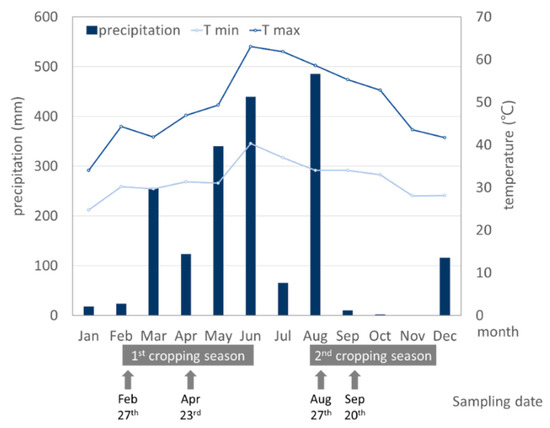 Monthly temperature and precipitation in 2019. The first cropping seasons was from mid-February to late June and the second season was from early August to late November. T min and T max are the monthly minimum and maximum temperature, respectively.