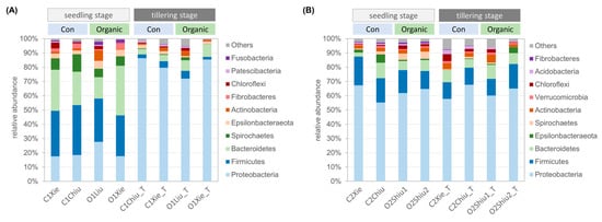 Relative abundance of the top 10 bacterial phyla in rice roots in the first (A) and second (B) cropping seasons. Con: Conventional farming system; Organic: Organic farming system.