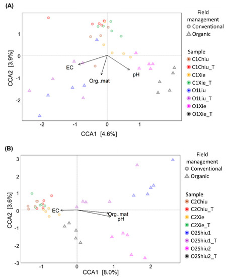 Canonical correspondence analysis (CCA) ordination diagram showing the correlation between rice root bacterial community composition and environmental variables in the first (A) and second (B) cropping season. The data points are colored by samples. The circle and triangle mean the samples from conventional and organic fields, respectively. Only the environmental variables that were statistically significant when assessed by the marginal test are shown. The direction and the length of arrows indicate the steepness increase and strength of variables, compared to others. EC: Soil electrical conductivity; Org.mat: Soil organic matter content; and pH: Soil pH.