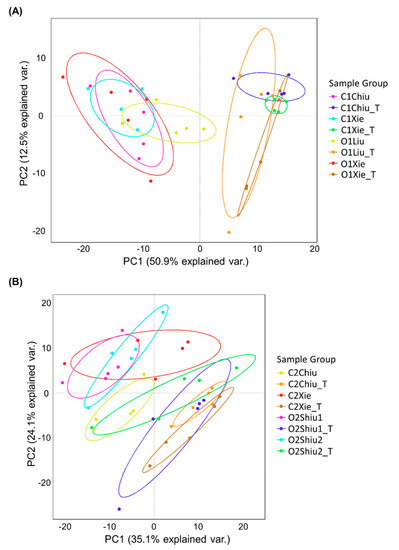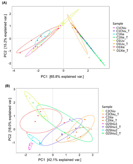 PCA of rice root endophytic bacterial communities based on filtered operational taxonomic units (OTU) tables in the first (A) and second (B) cropping season. The data points are colored by samples.