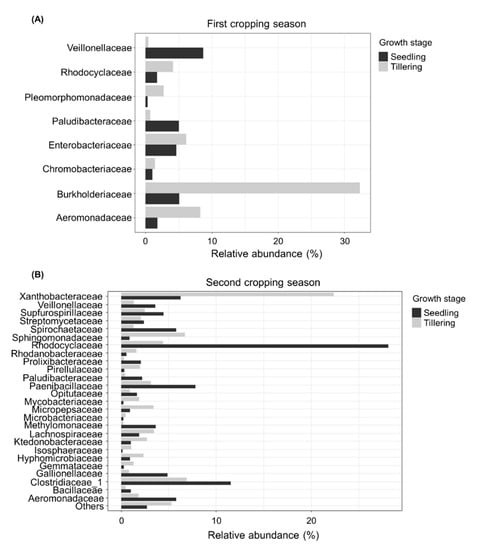 In our study, significant differences in root bacterial community composition between the two growth stages were observed in both cropping seasons. At the family level, Veillonellaceae was consistently enriched at the seedling stage, while at the genus level, Burkholderia and Pleomorphomonas were enriched at the tillering stage (Figure 5 and Figure S5). Burkholderia, which are known as PGPB, have nitrogen fixing and phosphorus solubilizing abilities [57,58]. In the second cropping season, we observed an increase of Bradyrhizobium and Sphingomonas at the tillering stage. Bradyrhizobium, which are known as nitrogen fixing, phosphorus solubilizing and siderophore producing rhizobacteria [58], had a relative abundance of more than 5% in rice root endophytic bacteria. The plant growth promoting activities of Sphingomonas were also demonstrated in recent papers [59,60,61]. It is possible that plants attract more beneficial bacteria as plant growth progresses and selectively allow them to colonize the roots to benefit plant health and development.