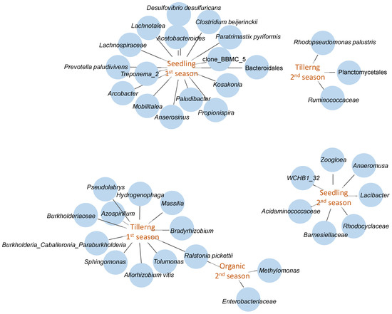 Next, we assessed the heterogeneity of the bacterial community composition across samples using β-diversity analysis based on Bray–Curtis distance. Although the field management system did not affect species diversity and richness, PERANOVA showed that it did influence the endophytic bacterial profile in both cropping seasons, especially at the tillering stage (Table 2 and Table S6). The variance of bacterial community composition between samples was further determined by PCA based on filtered OTU tables. PC1 and PC2 explained more than 40% of total variation in both cropping seasons. Although the PERANOVA result exhibited a significant difference between bacterial profiles under different field management systems, only a subtle clustering was observed in the PCA plots (Figure S1). We further identified the abundant taxa groups either under conventional or organic farming systems. Patescibacteria at the phylum level and Parcubacteria at the class level were consistently enriched at the tillering stage under the conventional farming system in both seasons, but no taxonomic group was consistently enriched under organic farming systems in both seasons (Figure S2). While only a few taxa consistently responded to field management, we found some genera comprising of the members known as plant growth promoting bacteria (PGPB) enriched in either one of the farming systems. At the tillering stage in the first cropping season, Pseudomonas was abundant under the organic farming system, while Bradyrhizobium and Burkholderia were enriched under the conventional farming system (Figure S3). In the second cropping season, Bacillus and Azospirillum were abundant both at the seedling and tillering stage under the organic farming system, while Bradyrhizobium and Sphingomonas were enriched only at the seedling stage under the conventional farming system (Figure S4).