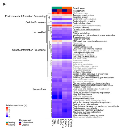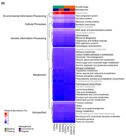 There were 26 and 44 categories that were enriched under either conventional or organic farming systems in the first and second cropping seasons, respectively. Eight categories were commonly identified in both seasons, but only “nucleotide metabolism”, “transcription related proteins”, and “glycosphingolipid biosynthesis” were consistently abundant under the organic farming system, and “nitrotoluene degradation” was enriched under the conventional farming system (Figure S6).