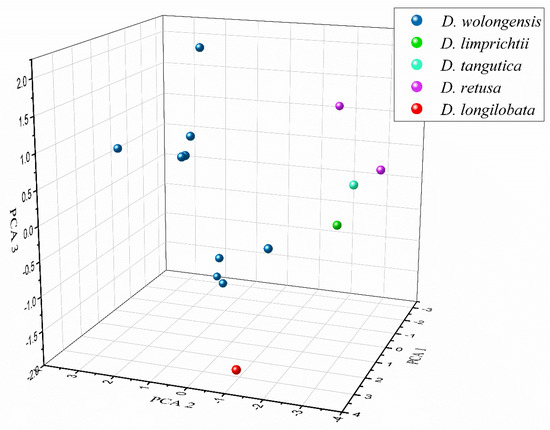 Principal Component Analysis (PCA) confirms a high level of morphological diversity between D. wolongensis individuals (Figure 1). The first three components represent 79.1 % genetic variability. In particular, component 1 discriminates between D. wolongensis and other Daphne spp. These results are supported by variance analysis (Figure S2).