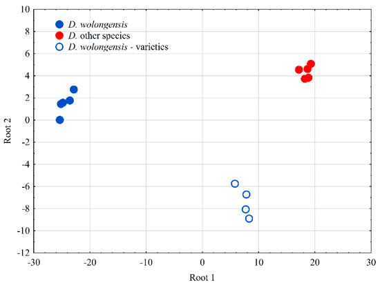 Using a forward stepwise method within Discriminant analysis, the following three variables were added to the model: bract width, bud scale length, and lobe width. The Wilks’ λ value of 0.00007 indicates the good discriminatory power of the model. The least value of the partial Wilks’ λ indicated that the variable bract width contributes most to the overall discrimination. Discriminant functions (roots) computed by canonical analysis were considered statistically significant (Root 1: χ2 = 68.59; p < 0.01; Root 2: χ2 = 23.89; p < 0.01). These results were visualized as a scatterplot of canonical scores (Figure 2). The first discriminant function (root) discriminates between D. wolongensis and other Daphne species, and the second function provides discrimination between wild individuals of D. wolongensis and its varieties. These results were confirmed by further classification based on the Mahalanobis distances and posterior probabilities (Table S4). All individuals with a full set of morphological data were correctly classified.