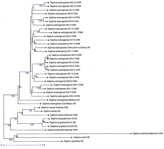 From 18 unique primer combinations (Table S6), we found 522 unique polymorphic loci from AFLP analysis of 38 Daphne spp. samples that were at our disposal. This corresponds to an average of 34.8 polymorphic bands per primer combination. Gene diversity ranged from 0 to 0.507, with an average of 0.222 (Table S7). The level of genetic diversity was the lowest in Daphne tangutica population (ĥ = 0.024; I = 0.034). The level of gene diversity of D. wolongensis is of moderate level (Table 2). A higher diversity was found in D. wolongensis varieties (ĥ = 0.108; I = 0.181). The highest genetic distance was found between D. calcicola and other Daphne species and the lowest between populations W1, W2, and W3 of D. wolongensis. The lowest genetic distance between D. wolongensis and other species is those between D. wolongensis and D. retusa (0.26), and then between D. wolongensis and D. limprichtii (0.28) (Table 3).