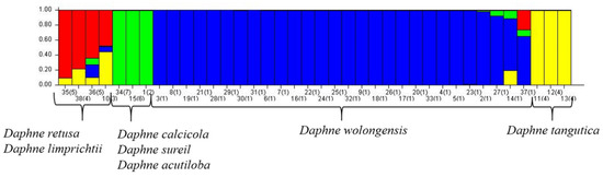 Cluster analysis of Daphne spp. based on a Bayesian approach. Each genotype is represented by a bar divided into K colors, where K is the number of clusters assumed in the analysis: K1—red color; K2—green color; K3—blue color; K4—yellow color. The y-axis represents posterior probability of individual assignment to genetic populations K1—K4.