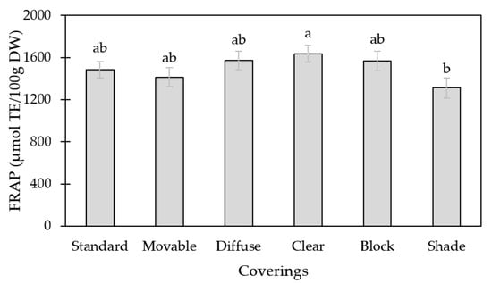 The clear covering resulted in greater antioxidant capacity, as compared to the fruit grown under the shade covering (p < 0.05; Figure 1).