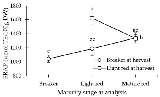 Antioxidant capacity as determined by FRAP method of tomato fruit harvested at breaker stage and analyzed at day 0, at light red stage (stored at 12.5 °C at 90% relative humidity (RH) until day 10 (or an a* value of 22)), and mature red stage (stored at 12.5 °C and 90% RH until day 10 (or an a* value of 22) + market shelf conditions of 21 °C and 65% RH 5 days (or an a* value of 28)). Light red mature fruit was analyzed at day 0, and at mature red stage (market shelf conditions of 21 °C and 65% RH for 5 days (or an a* value of 28)). Lsmeans (±SE) with same letter do not differ significantly at p < 0.05, Tukey’s HSD.
