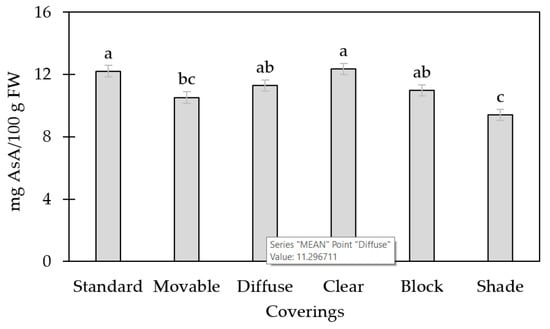 The AsA concentration was affected by high tunnel covering and maturity stage (p < 0.001 and <0.001, respectively). The standard and clear coverings were statistically similar and greater than the movable and shade coverings (Figure 3). AsA concentration decreased most under the shade covering, as compared to the other coverings.