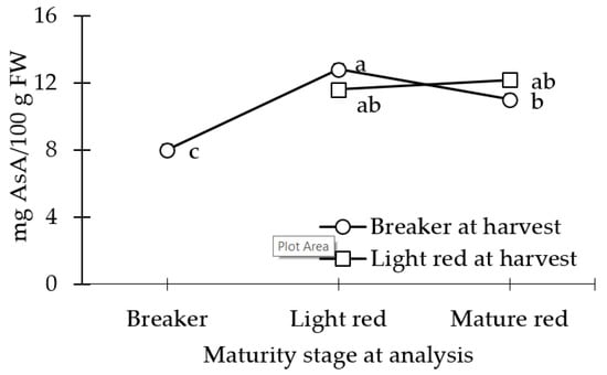 Ascorbic acid concentration (AsA) of tomato fruit harvested at breaker stage and analyzed at day 0, at light red stage (stored at 12.5 °C at 90% relative humidity (RH) until day 10 (or an a* value of 22)), and mature red stage (stored at 12.5 °C and 90% RH until day 10 (or an a* value of 22) + market shelf conditions of 21 °C and 65% RH 5 days (or an a* value of 28)). Light red mature fruits were analyzed at day 0, and at mature red stage (market shelf conditions of 21 °C and 65% RH for 5 days (or an a* value of 28)). Lsmeans (±SE) with same letter do not differ significantly at p < 0.05, Tukey’s HSD.