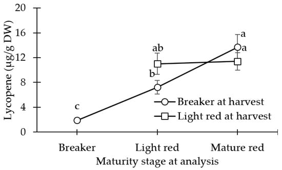 Lycopene concentration of tomato fruit harvested at breaker stage and analyzed at day 0, at light red stage (stored at 12.5 °C at 90% relative humidity (RH) until day 10 (or an a* value of 22)), and mature red stage (stored at 12.5 °C and 90% RH until day 10 (or an a* value of 22) + market shelf conditions of 21 °C and 65% RH 5 days (or an a* value of 28)). Light red mature fruit was analyzed at day 0, and at mature red stage (market shelf conditions of 21 °C and 65% RH for 5 days (or an a* value of 28)). Lsmeans (±SE) with same letter do not differ significantly at p < 0.05, Tukey’s HSD.