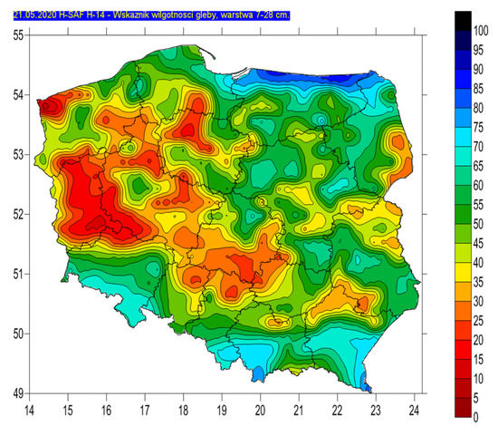 Spatial distribution of soil moisture (expressed as a percentage) in Poland, in the subsurface (depth from 7 to 28 cm) on 21 May 2020, created by EUMETSAT H-SAF, based on satellite data (ASCAT sensor, Metop satellites), using the ECMWF H-TESSEL model, with a spatial resolution of 25 km. Source: http://stopsuszy.imgw.pl/wilgotnosc/.
