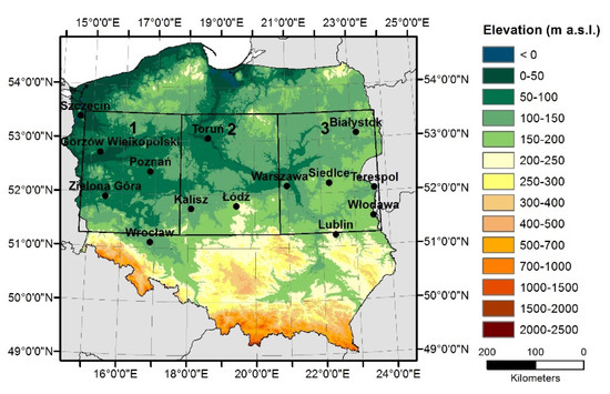 The study area covering the belt of lowlands in central Poland. Station data were provided by the Institute of Meteorology and Water Management—State Research Institute (IMGW-PIB). Data from the NASA Goddard Earth Sciences Data and Information Services Center (GES DISC) were divided into three equal subareas that were numbered, from west to east, as 1–3.