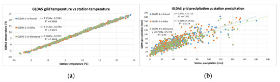 The GLDAS-2.1 data for the belt of lowlands in central Poland with a longitude between 14.875° E and 23.625° E and latitude from 51.375° N to 53.375° N were divided into three equal subareas that were numbered, from west to east, as 1, 2 and 3 (Figure 2). Each subarea has a dimension of 12 columns and 9 rows. Gridded GLDAS-2.1 data (mean air temperature and precipitation total) were compared with observed data from the meteorological stations (data for a grid box and station data located in this grid box). For this purpose, one station for every subarea was chosen: data from Poznań for the first (west) area; data from Kalisz for the second (middle) area and data from Warszawa for the third (east) area. Data correlation for temperature was very high, with the coefficient of determination (R2) exceeding 0.99 in all three cases; for precipitation, correlation was also quite good, with an R2 above 0.73 for Poznań (first area) and Warszawa (third area) and above 0.71 for Kalisz (second area) (see Figure 3).