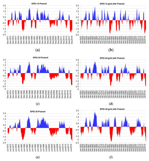 Values of SPEI 12 (Standardized Precipitation-Evapotranspiration Index for 12 months), SPEI 24 and SPEI 30 for Poznań from January 1971 to May 2020 based on station data (a,c,e) and gridded data for Poznań from January 1950 to May 2020 based on the SPEI global drought monitor (b,d,f).