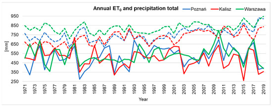 Annual reference crop evapotranspiration (ET0) (dashed line) and precipitation total (solid line) for three station: Poznań, Kalisz and Warszawa for the period of 1971–2019.