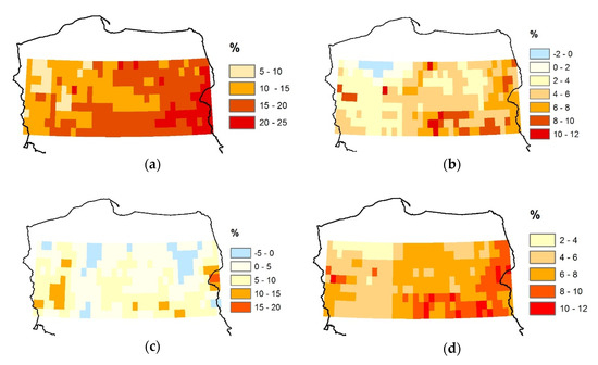Figure 6 presents the percentage decrease in monthly soil moisture contents in 2020 relative to the monthly mean (2000–2019) soil moisture contents at two depth ranges, 40 to 100 cm and 100 to 200 cm, in April and May. In eastern Poland for the shallower layer for April 2020 this decrease dropped by up to 25% (Figure 6a). The soil moisture content ranged for this layer from 40 to 220 kg m−2. A decrease for May 2020 at the depth range from 100 to 200 cm reached up to 12% in the eastern part of the country (Figure 6d). Figure 6c,d depicts a deep layer with soil moisture contents between 180 and 320 kg m−2. Additionally, it is worth pointing out that the 2000–2019 mean includes very dry years: 2003, 2006, 2015, 2018 and 2019. A decrease in monthly soil moisture contents in April and May 2020 was the highest in the eastern part of the studied area. This part has a greater annual precipitation (above 600 mm) than the central and western parts (below 600 mm). Furthermore, the amount of snow cover was larger and the annual temperature was lower [15], so the monthly 2000–2019 mean values of soil moisture content were higher there: 157, 166 and 168 kg m−2 for the first, second and third parts, respectively, for the depth range from 40 to 100 cm in April 2020; and 255, 270 and 268 kg m−2, respectively, for the depth range from 100 to 200 cm in May. After precipitation in May 2020 (below normal in the western, near normal in the central and above normal in the eastern part of the study), moisture conditions in the shallower layer improved (40–100 cm, Figure 6c) and became worse in the deeper layer (100–200 cm, Figure 6d).