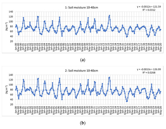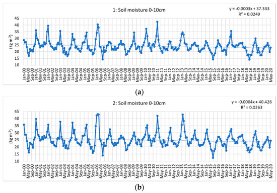 Changes in monthly soil moisture contents for several soil depth levels were examined for the aggregated area, i.e., mean values for cells from 12 columns and 9 rows for the period from January 2000 to May 2020.