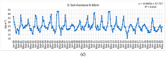 Monthly soil moisture contents in kg m−2 during the period from January 2000 to May 2020 for a range of depths from 0 to 10 cm, for (a) the first; (b) the second; and (c) the third subareas.