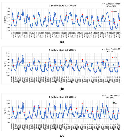 Monthly soil moisture contents in kg m−2 during the period from January 2000 to May 2020 for a range of depths from 100 to 200 cm, for (a) the first; (b) the second; and (c) the third subareas.