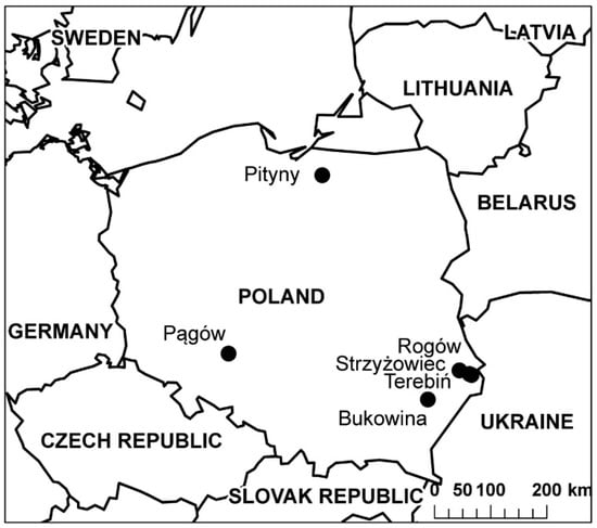 In 2017–2019, eight field experiments with maize for grain were conducted: four in 2017 (Pągów, Pityny, Rogów, and Strzyżowiec), 2 in 2018 (Rogów and Terebiń), and two in 2019 (Bukowina and Rogów) (Figure 1). The experiments were conducted on following soils: Pągów–Albic Podzols (sandy loam: clay–10%, sand–55%, silt–35%); Bukowina (loam: clay–20%, sand–35%, silt–45%), Pityny (sandy loam: clay–12%, sand–64%, silt–24%), Rogów (silty clay loam: clay–29%, sand–20%, silt–51%), Strzyżowiec (loam: clay–26%, sand–30%, silt–44%) and Terebiń (clay loam: clay–27%, sand–26%, silt–47%)–Endocalcaric Cambisol [].