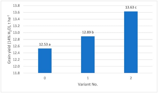 The density of maize plants in each location was approximately 85,000 per hectare. Plants that developed more than one cob were not found. The main differences between the studied combinations were observed for the grain yield and 1000 grain weight. Variant 1 caused a significant increase in the grain yield (by 2.9%), plant height (by 2.8%), grain yield per plant (by 2.7%), and 1000 grain weight (by 2.9%), and a significant reduction of grain moisture during harvest (by 6.1%) and straw yield (by 9.0%) compared to the control (Table 2, Figure 2).