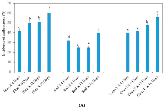 Inoculated cv. Hass, exposed to red LED light or treated with commercial fungicide showed more or less similar anthracnose incidence (30 to 32%) on day 4 in storage, whilst the fruit exposed to blue LED light showed higher (42%) anthracnose incidence (Figure 1B). At the same time, significantly lower anthracnose incidence was observed in inoculated fruit exposed to red LED on days 8, 12, and 16 in storage compared to fruit exposed to blue LED light or treated with commercial fungicide and stored for the respective periods. The highest anthracnose incidence (54%) appeared in inoculated fruits treated with commercial fungicide and held in storage for 16 days (Figure 1B).