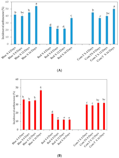 (A) Influence of light-emitting diode (LED) light exposure on inoculated avocado cultivar Fuerte. (B) Influence of LED light exposure on inoculated avocado cultivar Hass. The exposure of the fruit to blue or red LED light was for 6 h per day during storage. Ten replicate tray packs, each containing four fruit, underwent different postharvest treatments. Mean values of bars marked by different letters were significantly different at p < 0.05, according to Fisher’s protected LSD test. Blue, blue LED light; Red, red LED light; Com.T, commercial treatment.