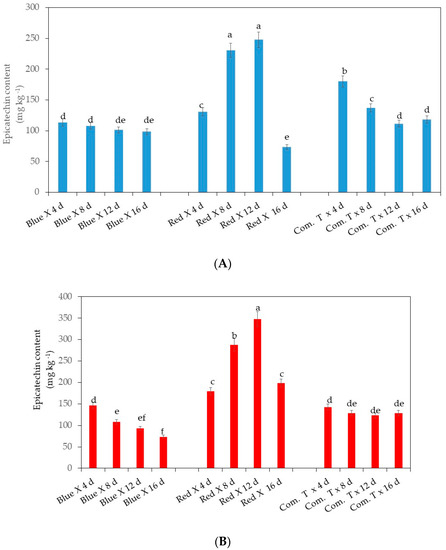 Significantly higher epicatechin content in the pericarp was detected in cv. Fuerte exposed to red LED light and stored for 8 and 12 days when compared to the fruit stored for 4 and 16 days (Figure 4A). It is interesting to note that cv. Fuerte exposed to red LED light and stored for 8 and 12 days showed higher epicatechin content than the fruit exposed to blue LED light or treated with commercial fungicide and stored for 4, 8, 12, and 16 days (Figure 4A).