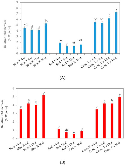 (A). Influence of LED light exposure on LOX (lipoxygenase) gene expression in avocado cultivar Fuerte. (B). Influence of LED light exposure on LOX (lipoxygenase) gene expression in avocado cultivar Hass. The exposure of fruit to blue or red LED light was for 6 h per day during storage. Number of replicates per treatment n = 5. Mean values of bars marked by different letters were significantly different at p < 0.05, according to Fisher’s protected LSD test. Blue, blue LED light; Red, red LED light; Com. T, commercial treatment.