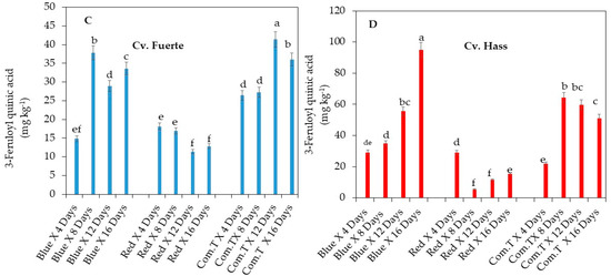 Conversely, the significantly lowest concentrations of 3-feruloyl quinic acid were in cv. Fuerte fruit exposed to red LED light treatment and stored for 12 and 16 days (Figure 6C) when compared to the fruit treated with commercial fungicide or exposed to blue LED light and stored for similar extended storage periods. (Figure 6B). Red light exposure showed a similar trend in cv. Hass, but significantly lowest concentrations of 3-feruloyl quinic acid were found in fruit exposed to red LED light and stored for 8 and 12 days when compared to all other postharvest treatments adopted in this study (Figure 6D).