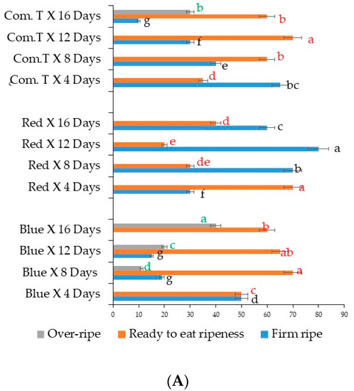 2.5. Percentage of Ripe and Ready-to-Eat Stage Fruit under Different Postharvest Treatments and Storage Periods
