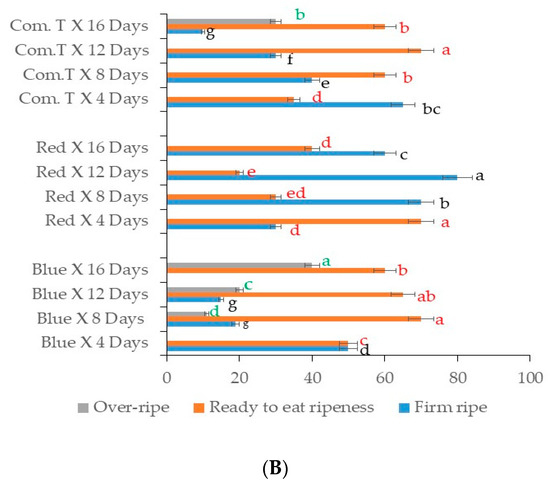 A similar ripening trend was observed in cv. Hass as well, with the fruit exposed to red LED light and stored for 8, 12, and 16 days being firmer than fruit that underwent other postharvest treatments and were stored at different storage periods (Figure 7B). Approximately 70 to 75% of cv. Hass fruit exposed to red LED and stored for 8 to 16 days were firmer when compared to the fruit from blue LED light or chemical fungicide treatment (Figure 7B). Conversely, commercial fungicide treated fruit stored for 12 days or fruit exposed blue LED light and stored up to 8 days showed the highest percentages of ready-to-eat stage ripe fruit. Furthermore, cv. Hass fruit exposed to blue LED light and stored for 12 and 16 days showed around 22 to 28% overripe fruits, and commercial fungicide treated fruit stored for 16 days also showed 30% overripe fruit.