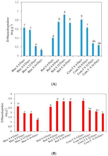 The D-mannoheptulose content was significantly highest in cv. Fuerte exposed to red LED light and stored for 12 days when compared to the other two postharvest treatments and at similar storage periods (Figure 8A). Fruit exposed to red LED light and stored for 8 and 16 days and commercial fungicide treated fruit stored for 4 days showed higher concentrations of D-mannoheptulose sugar than the other counterpart treatments and storage periods. It is interesting to note that the fruit exposed to blue LED light for 12 and 16 days or commercial fungicide treated fruit stored for 12 and 16 days showed significantly lower concentrations of D-mannoheptulose sugar (Figure 8A).
