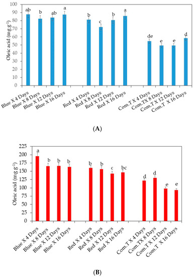 (A) Influence of LED lights on oleic acid content in the mesocarp of avocado cultivar Fuerte. (B) Influence of LED lights on oleic acid content in the mesocarp of avocado cultivars Hass and Fuerte. Mean ± standard deviation values for each bar were calculated based on five fruits. Number of replicates per treatment n = 5. Mean values of bars marked by different letters were significantly different at p < 0.05, according to Fisher’s protected LSD test. Blue, blue LED light; Red, red LED light; Com.T, commercial treatment.