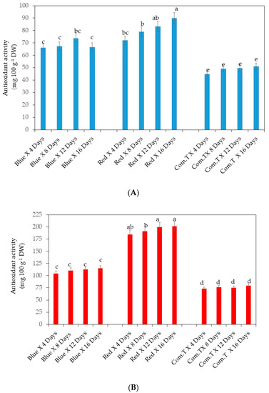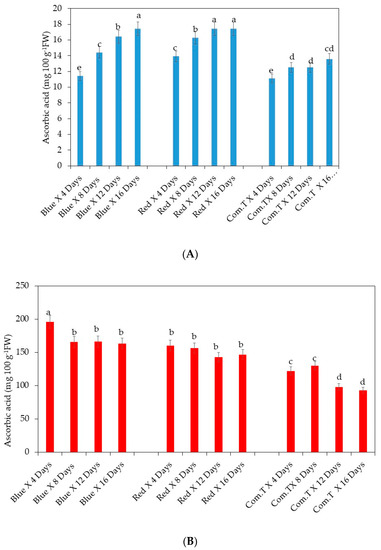 Overall, the ascorbic acid content was significantly lower in commercial fungicide treated cv. Fuerte fruit compared to the fruit exposed to blue LED light and stored for 6, 12, and 16 days or red LED light and stored for 4, 8, 12, and 16 days in storage (Figure 10A). Likewise, there were lower concentrations of ascorbic acid content detected in commercial fungicide treated fruit when compared to the blue or red LED light treated fruit stored for 4 to 16 days onwards. In other words, exposure to blue or red LED light improved the biosynthesis of ascorbic acid in cv. Hass (Figure 10B).