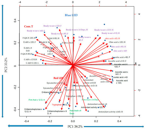 Principal component analysis (PCA) showing correlation loadings of fruit phenolic compounds; epicatechin in the pericarp; tryptophan, D-mannoheptulose sugar, ascorbic acid, oleic acid, and antioxidant activity in the mesocarp; and fruit ripeness related to the LED light treatments in comparison to the commercial treatment. F-QA, 3-feruloyl quinic acid; C-AH, coumaric acid hexoside; D, days; H, cv. Hass; F, Cv. Fuerte.