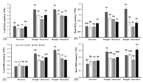 Hydrogen peroxide (H2O2) and malonaldehyde (MDA) accumulation in leaves (A,C) and roots (B,D) of non-inoculated plants (No arbuscular mycorrhizal (AM) and plants inoculated by R. irregularis (AM1), F. mosseae (AM2), or F. coronatum (AM3) subjected to non-stress (NoS), drought + heat stress, and drought + heat shock. Each bar represents the mean and standard deviation (n = 4). Different minuscules indicate significant difference among treatments under the same conditions (no stress, drought + heat stress, or drought + heat shock) by Duncan’s post hoc test at p ≤ 0.05. Different capital letters indicate significant differences of the same treatments (No AM, R. irregularis, F. mosseae, or F. coronatum) under different conditions (no stress, drought + heat stress, and drought + heat shock) by Duncan’s post hoc test at p ≤ 0.05.