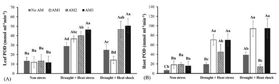 The activity of peroxidase (POD) in leaves (A) and roots (B) of non-inoculated plants (No AM) and plants inoculated by R. irregularis (AM1), F. mosseae (AM2), or F. coronatum (AM3) subjected to non-stress (NoS), drought + heat stress (D + H), and drought + heat shock (D + HS). Each bar represents the mean and standard deviation (n = 4). Different minuscules indicate significant differences among treatments under the same conditions (no stress, drought + heat stress, or drought + heat shock) by Duncan’s post hoc test at p ≤ 0.05. Different capital letters indicate significant differences of the same treatments (No AM, R. irregularis, F. mosseae, or F. coronatum) under different conditions (no stress, drought + heat stress, and drought + heat shock) by Duncan’s post hoc test at p ≤ 0.05.
