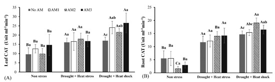 The activity of catalase (CAT) in leaves (A) and roots (B) of non-inoculated plants (No AM) and plants inoculated by R. irregularis (AM1), F. mosseae (AM2), or F. coronatum (AM3) subjected to non-stress (NoS), drought + heat stress (D + H), and drought+ heat shock (D + HS). Each bar represents the mean and standard deviation (n = 4). Different minuscules indicate significant differences among treatments under the same conditions (no stress, drought + heat stress, or drought + heat shock) by Duncan’s post hoc test at p ≤ 0.05. Different capital letters indicate significant differences of the same treatments (No AM, R. irregularis, F. mosseae, or F. coronatum) under different conditions (no stress, drought + heat stress, and drought + heat shock) by Duncan’s post hoc test at p ≤ 0.05.