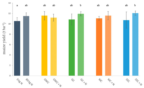 Maize yield (mean ± SD; n = 4). Columns with the same lowercases letters are not significantly different (p ≤ 0.05) between treatments. Control (0 kg N), 80 kg mineral N ha−1 (80 kg N), urban organic waste compost (OWC), green waste compost (GC), farm yard manure compost (MC), sewage sludge compost (SSC), + N application of 80 kg N ha−1.