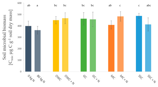 Soil microbial biomass (Cmic) was higher in soils treated with organic amendments; however, not all differences were significant. While OWC, GC and SCC (regardless of the N application) showed similar values for Cmic (410–470 µg C g−1 soil), soils that received 80 kg N ha−1 showed significantly lower values (360 µg C g−1 soil). The control (400 µg C g−1 soil) and treatment MC (410 µg C g−1 soil) showed a significantly lower microbial biomass than soils treated with MC + N or SSC (Figure 2).