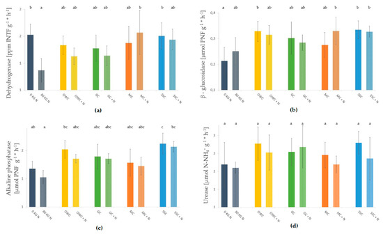 Soil enzymatic activities (dehydrogenase (a), β-glucosidase (b), alkaline phosphatase (c) and urease (d)) (mean ± SD; n = 4). Columns with the same lowercases letters are not significantly different (p ≤ 0.05) between treatments. Control (0 kg N), 80 kg mineral N ha−1 (80 kg N), 175 kg N ha−1 of composts, urban organic waste compost (OWC), green waste compost (GC), farm yard manure compost (MC), sewage sludge compost (SSC), + N application of 80 kg N ha−1.