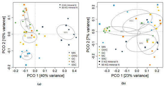 The bacterial/archaeal community compositions differed significantly among 0 kg N, 80 kg N, SSC, OWC, GC and MC (independent from N addition)-treated soils as calculated from a presence–absence distance matrix (measure = Jaccard, RAdonis2 = 0.396, pAdonis = 0.001) (Figure 4a). For the fungal community, such differences were less pronounced (RAdonis2 = 0.14, pAdonis = 0.002) (Figure 4b). The amount of nitrogen added to the soil affected neither fungal nor bacteria/archaeal community composition. Therefore, OTU counts were averaged for soils treated with organic amendments.