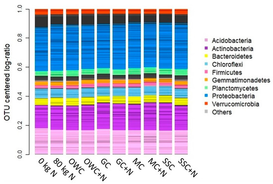 Interestingly, the control and 80 kg N and OWC treated soils seemed most comparable in Venn analysis, while MC, GC and SSC had a higher number of OTUs detected only in soil samples in those treatments (Figure 6). Soils treated with SSC had more unique OTUs. Those OTUs solely detected in SSC treated soil were taxonomically diverse. Frequently, Paenibacillaceae (Firmicutes), Gemmatimoadaceae (Gemmatimonadetes) and Planctomycetaceae (Planctomycetes) were identified. In addition, Solibacteraceae (Acidobacteria), Cytophageceae (Bacteroidetes), Anaerolinaceae and Caldilineaceae (Chloroflexi) and Bdellovibrionaceae and Haliangiaceae (Proteobacteria) were found. Based on both presence–absence (Figure 5) and relative abundance (Table S2), Blastocatellales (Acidobacteria) and Gaiellales (Actinobacteria) seem to be characteristic for SSC treated soils. In GC soils, unique OTUs were annotated as Haliangium and Sorangium (Myxococcales, Proteobacteria) and Planctomycetales (Planctomycetes). In MC soils, unique OTUs often belonged to Clostridia (Firmicutes) and Proteobacteria (order Myxococcales and genus Aquicella). In OWC soils, most unique OTUs belong to Proteobacteria (Myxococcales) and Planctomycetales (Planctomycetes).
