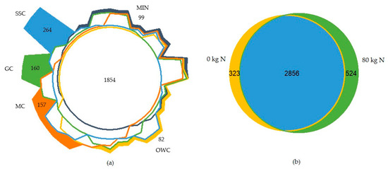 Venn-diagram of the bacterial/archaeal community regarding treatment factor “compost” (a) and regarding treatment factor “N application” (b). The number in the middle of the circle indicates the number of OTUs shared by all treatments. Numbers near a treatment name show the number of OTUs exclusively found in soils fertilized with this treatment. Use of colors in (a) was done according to Figure 1, Figure 2 and Figure 3; and in (b) yellow, blue and green code for 0 kg N, core and 80 kg N, respectively.